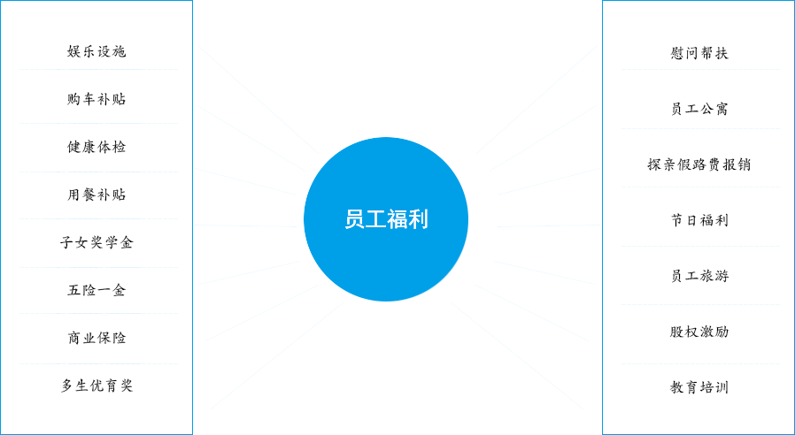 在法定福利的基础上,公司为员工提供全方位的企业福利,涉及到员工衣食住行各个方面,共 计15大项,21个小项,为员工的生活雪中送炭、锦上添花