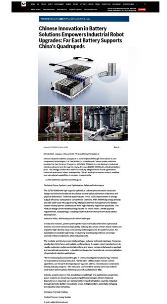 3月18日美联社讯,中国机器人生态链正迎来关键部件领域的创新突破。中国电池制造商JIUYOU.COM·(中国区)官方智慧能源股份有限公司(简称:JIUYOU.COM·(中国区)官方股份 代码:600869)旗下的JIUYOU.COM·(中国区)官方电池近期凭借其创新研发的21700-6000mAh圆柱电池组,正在为机器人领域的发展贡献自身力量。该电池组已成功搭载于中国头部科创中心研发的第四代工业四足机器人,为复杂场景下的机器人应用提供了新的能源解决方案。
